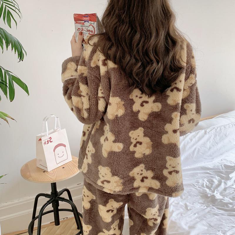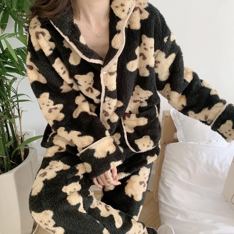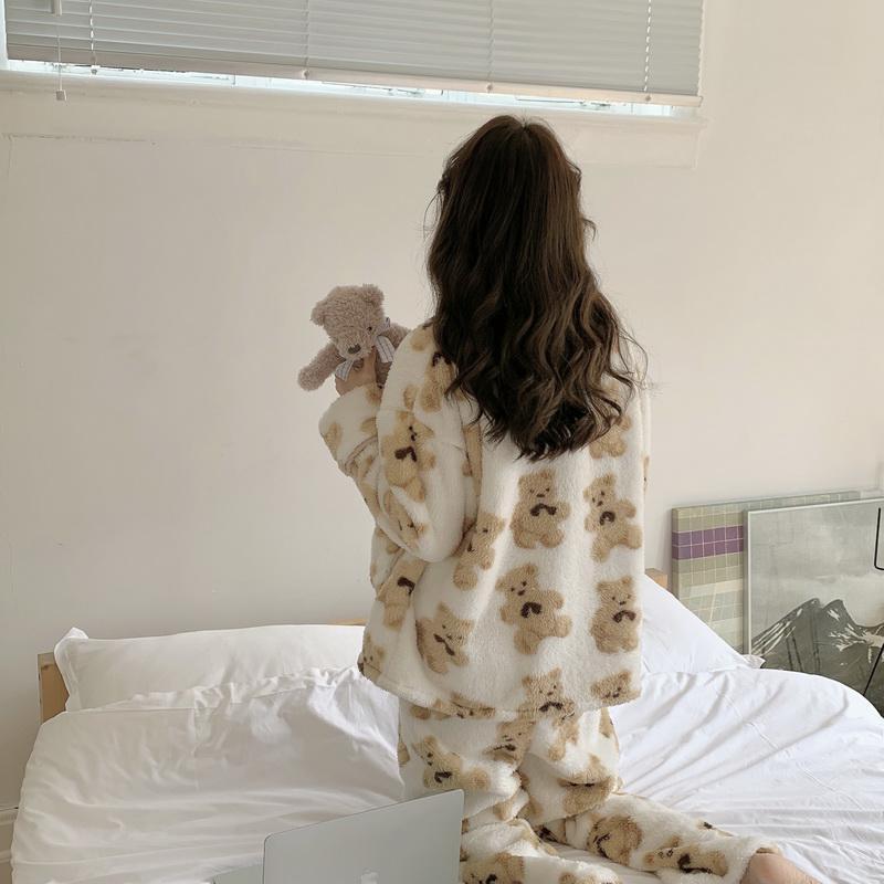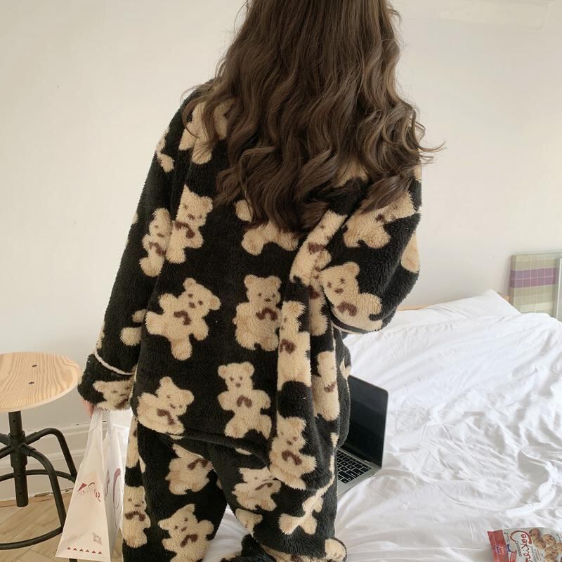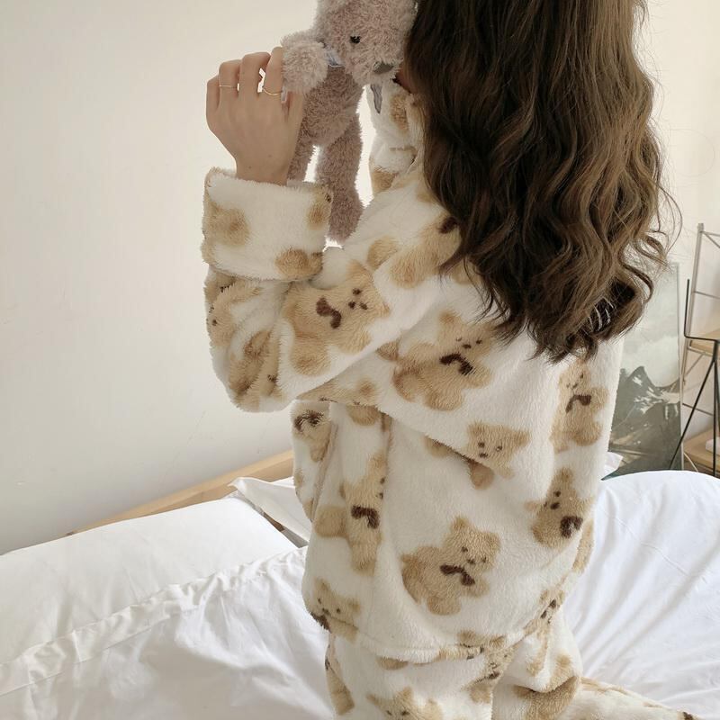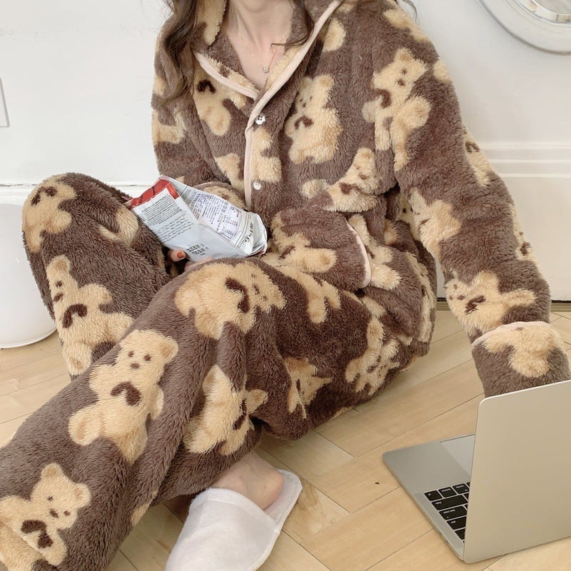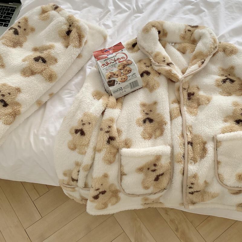 【送料無料】3色 もこもこ ルームウェア セットアップ ツーピース 上下セット クマ プリント ふわふわ 個性的 暖かい 可愛い ラブリー キュート 秋冬 着る毛布 レディース 部屋着 ラフ ナイトウエア パジャマ 寝間着 お家コーデ ホワイト ブラウン ブラック ワンサイズ フリーサイズ インスタ映え 普段使い デイリー使い お泊り 女子会 お揃い 双子 旅行 パジャマパーティ 主役級 トレンド 抜け感 オシャレ ゆったり らくちん ルーズ ゆる プチプラ プレゼント 10代 20代 db4554