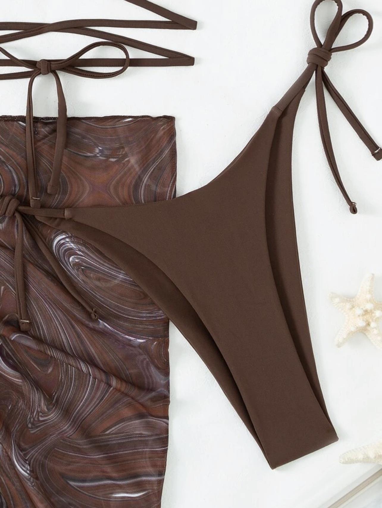 【送料無料】8色 ブラジリアン ビキニ 水着 レディース セクシー マイクロビキニ 紐ビキニ 3点セット 上下セット バンドゥ風 マーブル模様 パレオ付き お尻カバー 太ももカバー 体型カバー 谷間見せ 海外 水着 黒 パープル 赤 青 緑 オレンジ 個性的 モデル 衣装 グラビア 撮影 スイムウェア 存在感 女っぽ 大人可愛い おしゃれ 脚長 スタイルアップ 美スタイル S M L ブラウン ブラック パープル レッド ブルー グリーン バイカラー db4635