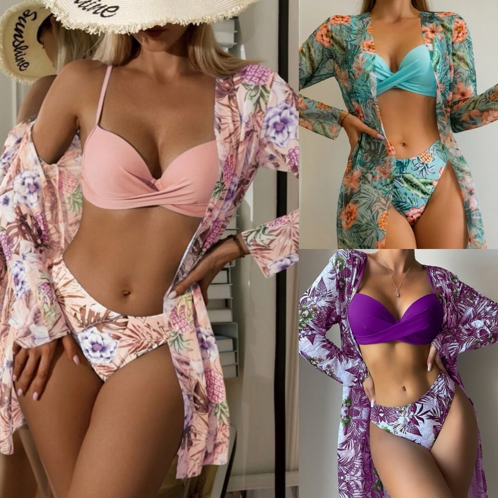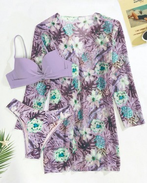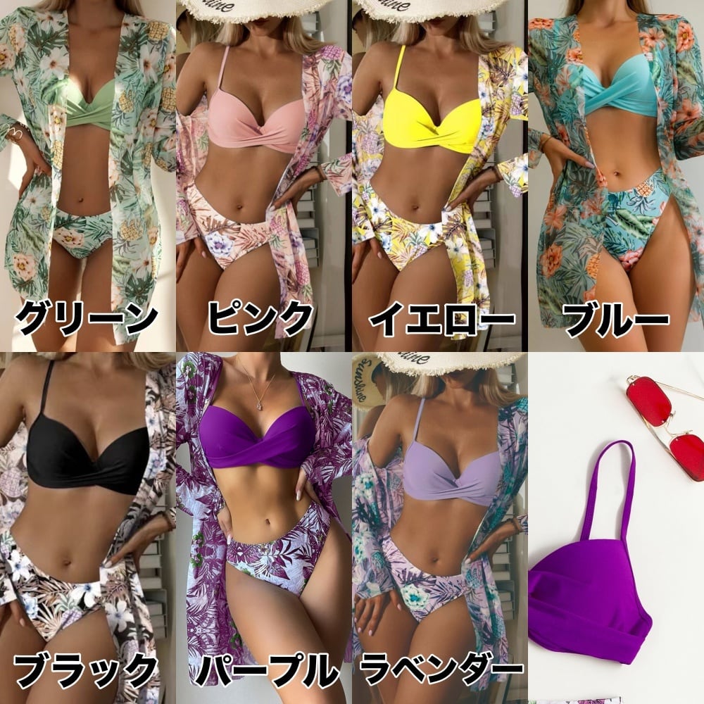 【送料無料】7色 ブラジリアン ビキニ 水着 レディース 体型カバー シャツ 羽織 3点セット 花柄 ボタニカル フラワー ハワイ トロピカル バイカラー ワイヤー入り 紐ビキニ 三角ビキニ 個性的 長袖 ラッシュガード レトロ かわいい 黒 ピンク 黄色 緑 青 紫 パープル ブラック ブルー グリーン イエロー かっこいい ハイレグ ハイウエスト 海外 モデル 写真 撮影 グラビア 衣装 お尻カバー 水着 透け感 きれいめ おしゃれ 女っぽ ブラ S M L 二の腕カバー 日焼け防止 db4660