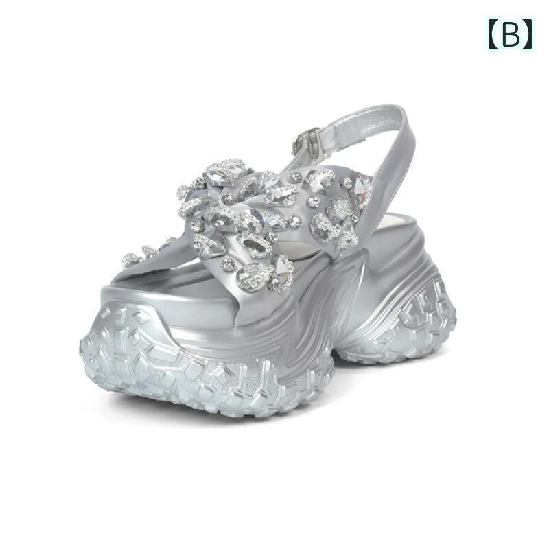 スポサン 厚底 サンダル ビジュー キラキラ スポーツサンダル レディース 大人 韓国風 個性的 きれいめ シューズ ビーサン ストラップ 黒 シルバー 銀色 メタリック クリスタル 宝石 コンフォート 無地 スリッパ ゴツい 可愛い ユニーク ブラック