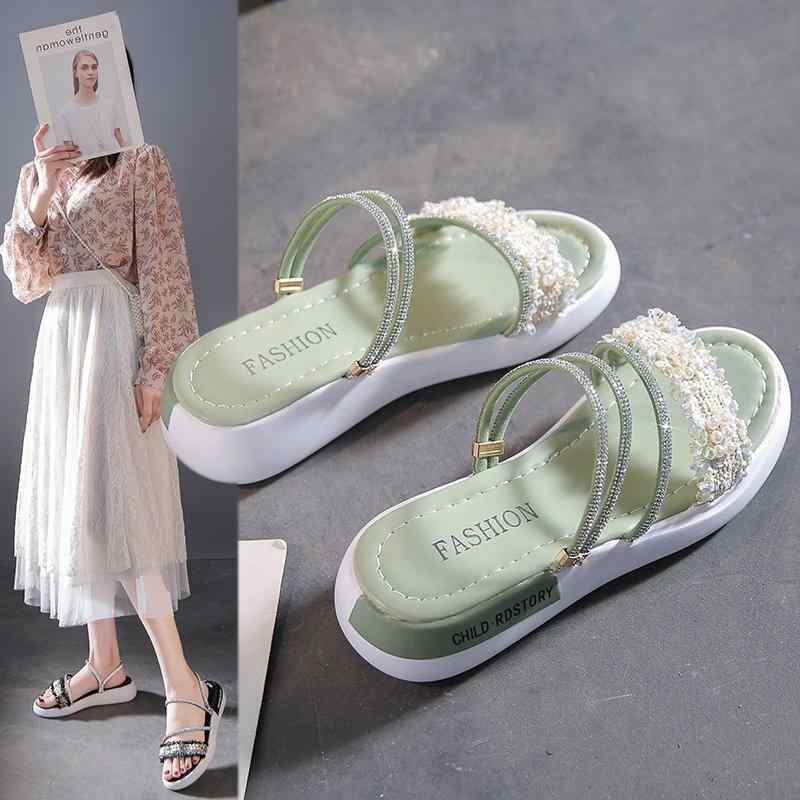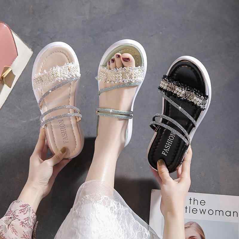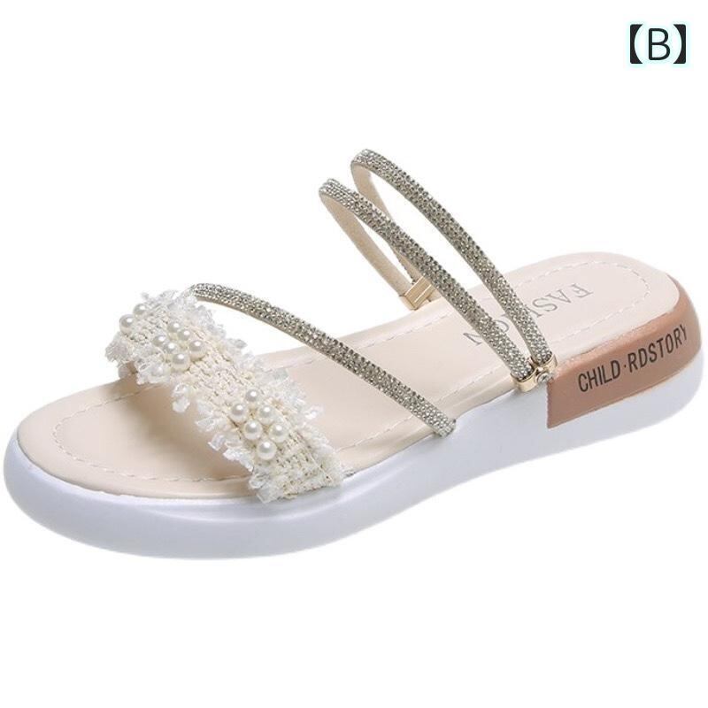 サンダル レディース かわいい ビーサン キラキラ ビジュー クリスタル 韓国風 春夏 シューズ ミュール 個性的 ビーチサンダル ラウンストーン 黒 白 緑 厚底 オープントゥ スリッポン 靴 ガーリー ラブリー 黒無地 フラット ラウンドトゥ