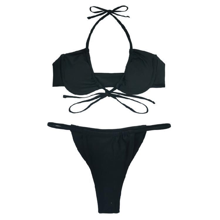 ビキニ セクシー ブラジリアン 水着 レディース 紐 かっこいい tバック 三角ビキニ マイクロビキニ 黒 ブラック ベージュ 無地 ホルターネック セパレート 水着 女性用 海外 モデル クール 露出 日焼け 撮影 衣装 グラビア パッド入り リボン