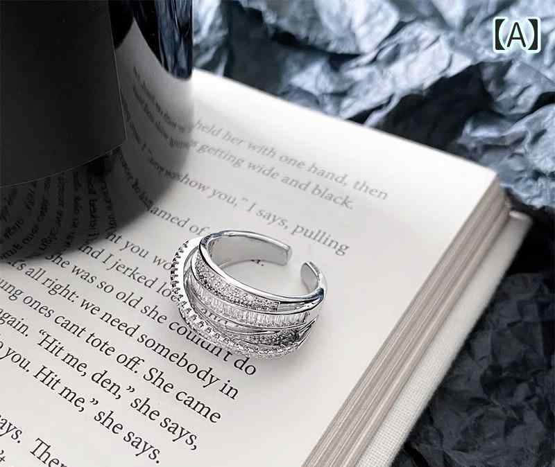 オープンリング キラキラ ラインストーン 重ね付け風 リング 指輪 韓国系 メタリック シルバー フリーリング フォークリング 個性的 きれいめ 華やか 銀色 ビジュー クリスタル アクセサリー パーティー お呼ばれ ワイド 太め 存在感 フォーマル