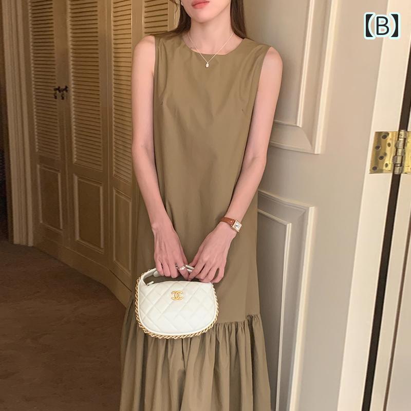シャツワンピース ロング ノースリーブ フリル 切り替えデザイン きれいめ ワンピース ドレス フレア ギャザー 韓国系 おしゃれ レディース 袖なし コットン ロングワンピース 薄手 バックシャン 黒 ブラック ベージュ カーキ 無地 ゆったり ラフ
