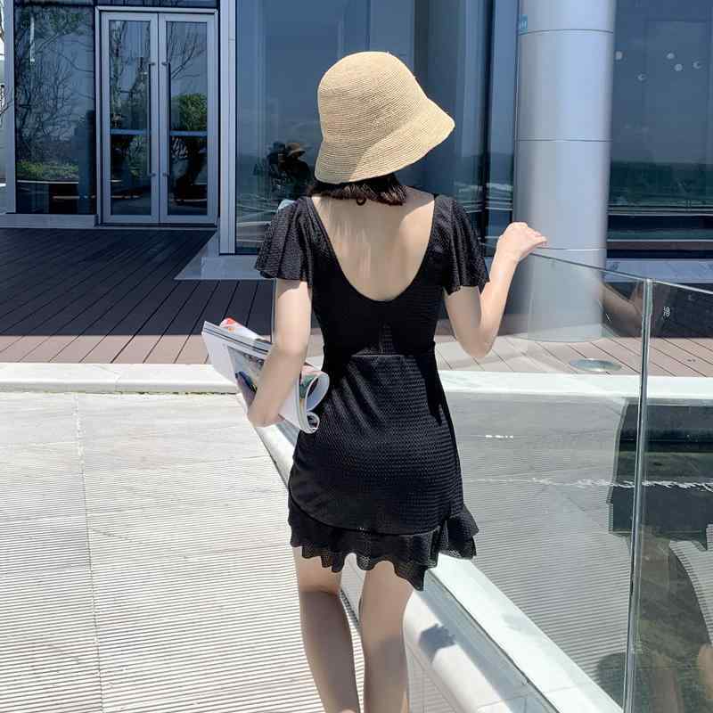 ワンピース 水着 スカート レディース きれいめ ギャザー 体型カバー 水着 韓国系 黒 赤 カーキ 無地 シャーリング フリル 大人可愛い 小悪魔 半袖 ワンピ 水着 女性用 オールインワン 袖あり リボン 大きいサイズ 背中開き Vネック ママ