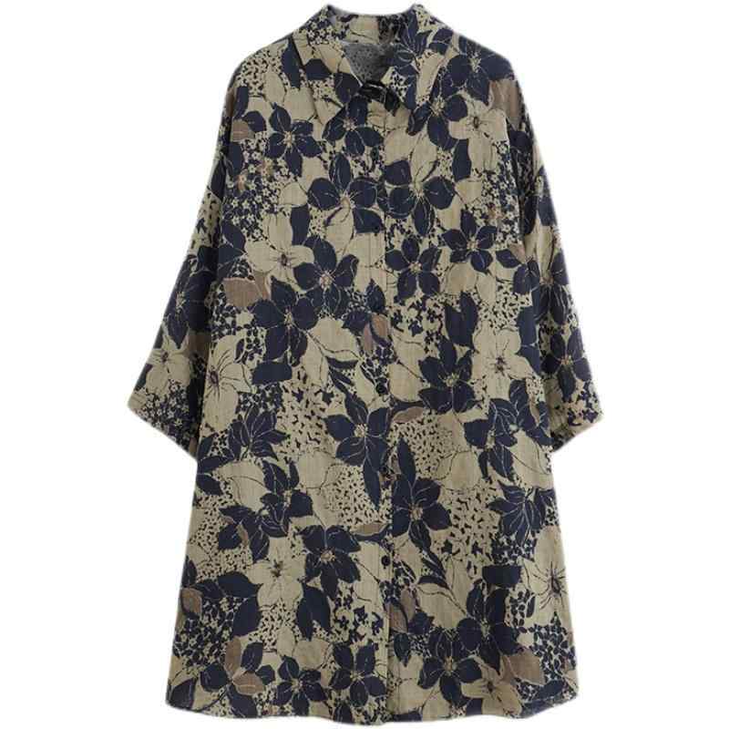 ロングシャツ 花柄 おしゃれ シャツ ロング丈 ルーズ ブラウス 映えボタン フラワー ボタニカル 大きめ ダボっと トップス レディース 渋色 ニュアンスカラー アジアン エスニック 半袖 5分袖 涼しげ 春夏 ママコーデ ゆるっと 楽ちん 前ボタン