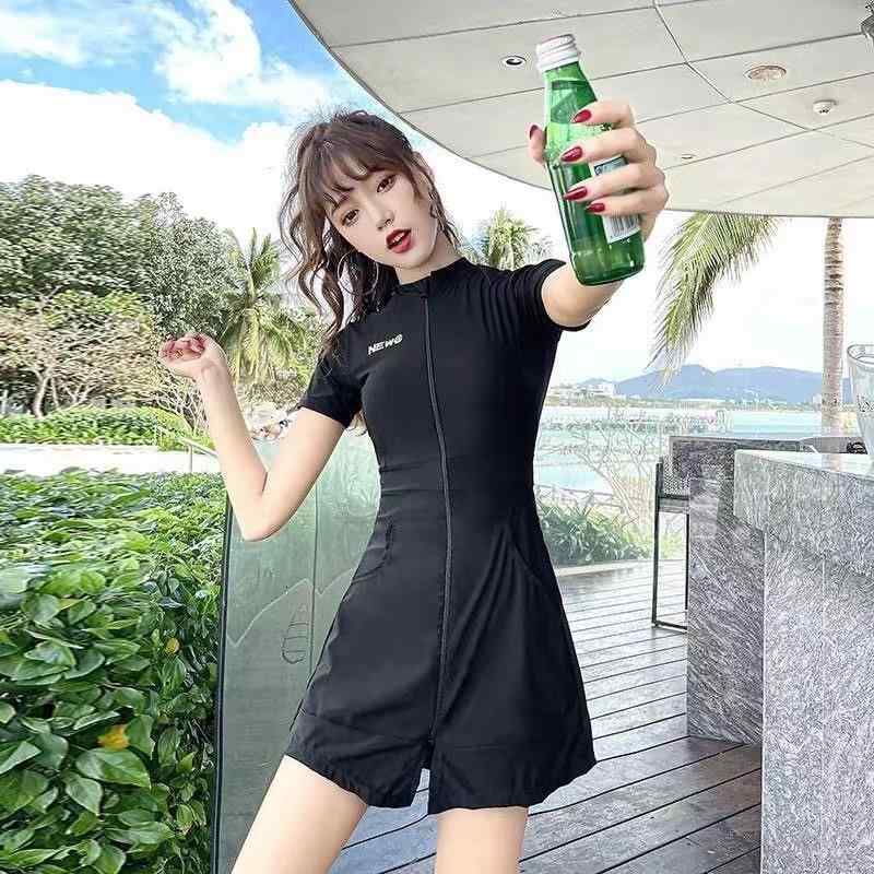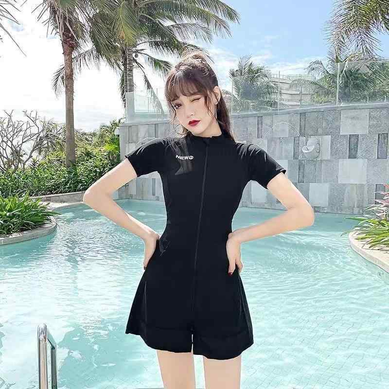 ワンピース 水着 黒 スポーティー 可愛い つなぎ ブラック 無地 韓国風 女子 半袖 袖あり 体型カバー 水着 スイムウェア ショートパンツ ホットパンツ カジュアル キュート 日焼け防止 お尻 お腹 太もも 隠し スクール 学生 露出少 ラフ