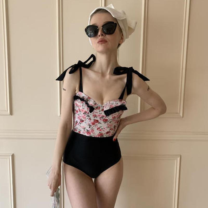 ワンピース 水着 レトロ 花柄 バイカラー 可愛い ハイウエスト リボン フラワー柄 ワンピ水着 フリル フリフリ ガーリー 韓国系 女子 海外 モデル オールインワン スイムウェア つなぎ 青 黒 赤 ピンク ブラック ブルー レッド 小花柄