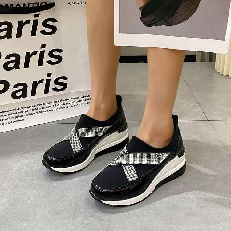 スニーカー 黒 厚底 キラキラ ラインストーン レディース スリッポン シューズ きれいめ 大人 個性的 かっこいい 韓国系 華やか クリスタル ブラック 無地 バイカラー 存在感 ランニング ウォーキング 痛くない 履きやすい 運動靴 ラフ シンプル