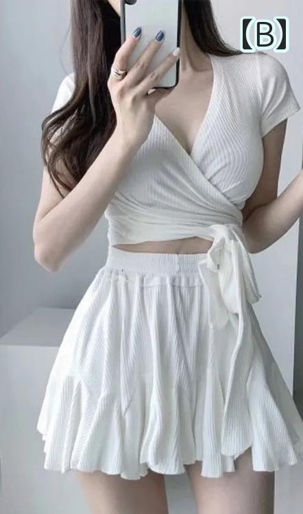 ビキニ スカート 体型カバー 水着 韓国風 かわいい 黒 ビキニ Tシャツ 半袖 トップス セパレート レディース ハイウエスト リボン きれいめ 二の腕 尻 脚 カバー スイムウェア 白 ピンク 無地 女の子 ニット クロシェ 上下セット ガーリー