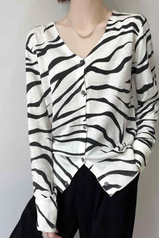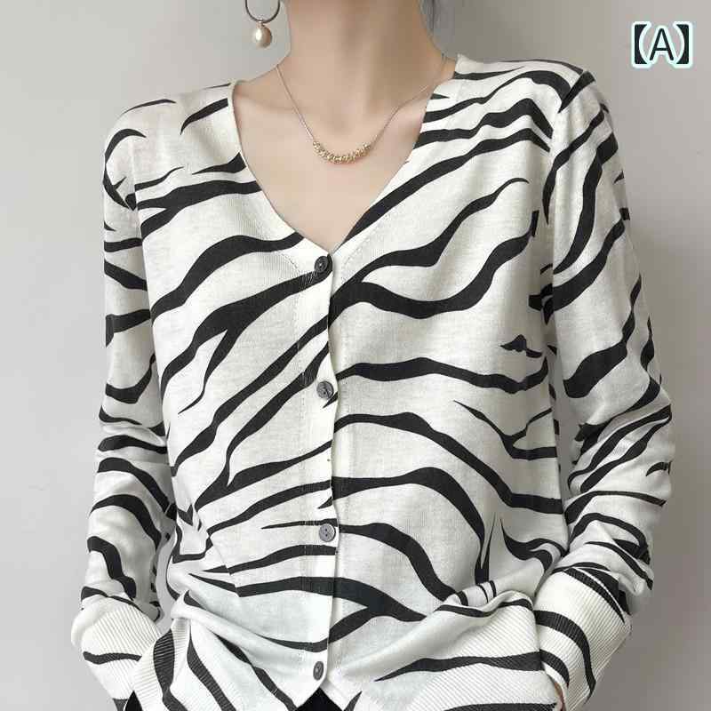 カーディガン ニット ゼブラ柄 しまうま 縞々 個性的 vネック 長袖 トップス レディース きれいめ おしゃれ 薄手 前開き セーター ボタン 白 ホワイト 黒 ブラック モノトーン かっこいい クール 大人カジュアル アニマル柄 ユニーク こなれ感