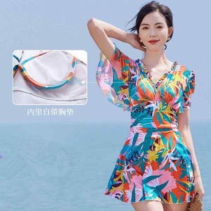 ワンピース 水着 スカート レディース 袖あり 体型カバー ボタニカル リーフ柄 花柄 カラフル 韓国系 大人可愛い きれいめ ドッキング ワンピ 水着 半袖 カシュクール ハイウエスト 二の腕 腹 尻 脚 カバー オールインワン MIXカラー 目立つ