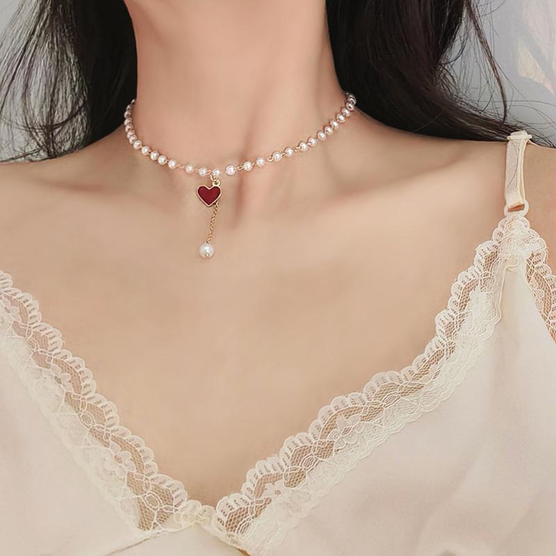 チョーカー ハート パール ネックレス 可愛い レトロ 韓国系 細身 華奢 ペンダント 揺れる ハート型 チャーム 白 ホワイトパール 金色 ゴールドチェーン ガーリー フレンチ パーティー お呼ばれ アクセサリー 映える カラフル 存在感 女っぽ