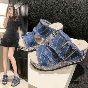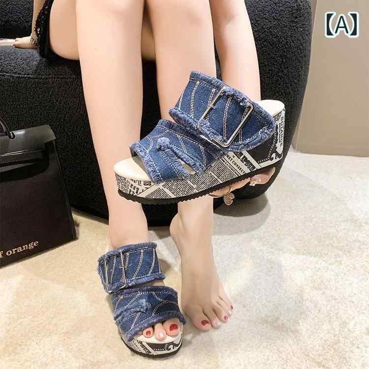 サンダル デニム ウエッジソール かっこいい 厚底 スリッポン ミュール ベルトデザイン 新聞 雑誌風 ブルーデニム 切りっぱなし フリンジ加工 かわいい 個性的 春夏 シューズ 韓国系 女子 きれいめ ハイヒール ウエッジヒール 脚長 くつ クツ