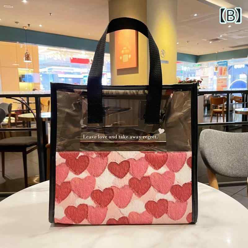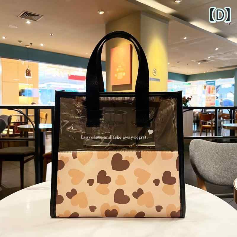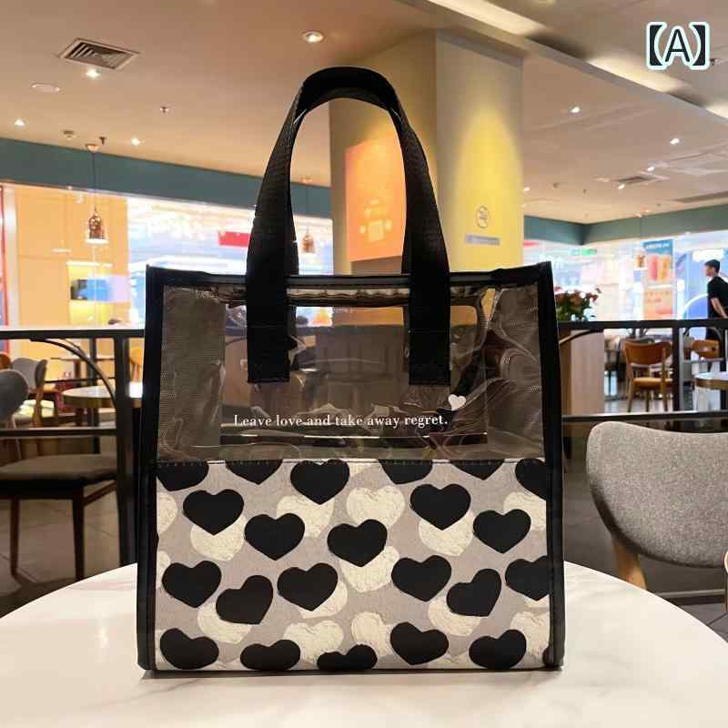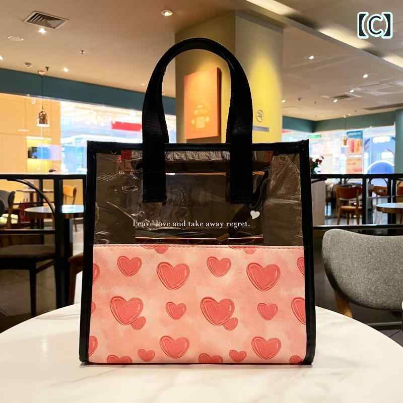 ハンドバッグ ハート バイカラー トートバッグ 韓国系 可愛い スクエア型 黒 ブラック 四角 手提げ 肩がけ バック ビニール 透明 クリアバッグ 透け感 ピンク 赤 レッド ベージュ 切り替えデザイン 個性的 総柄 夏 サマー ユニーク おしゃれ