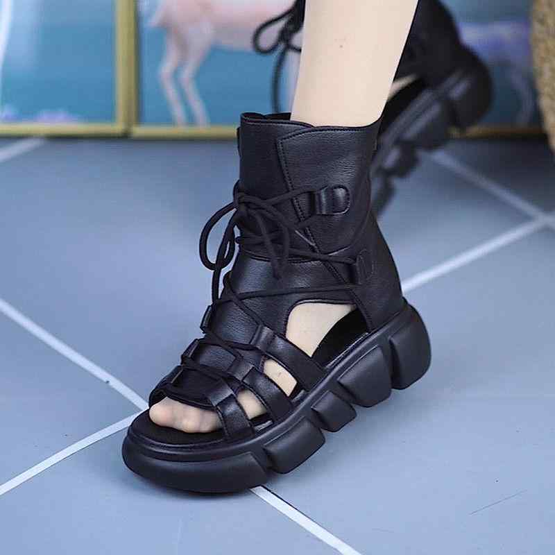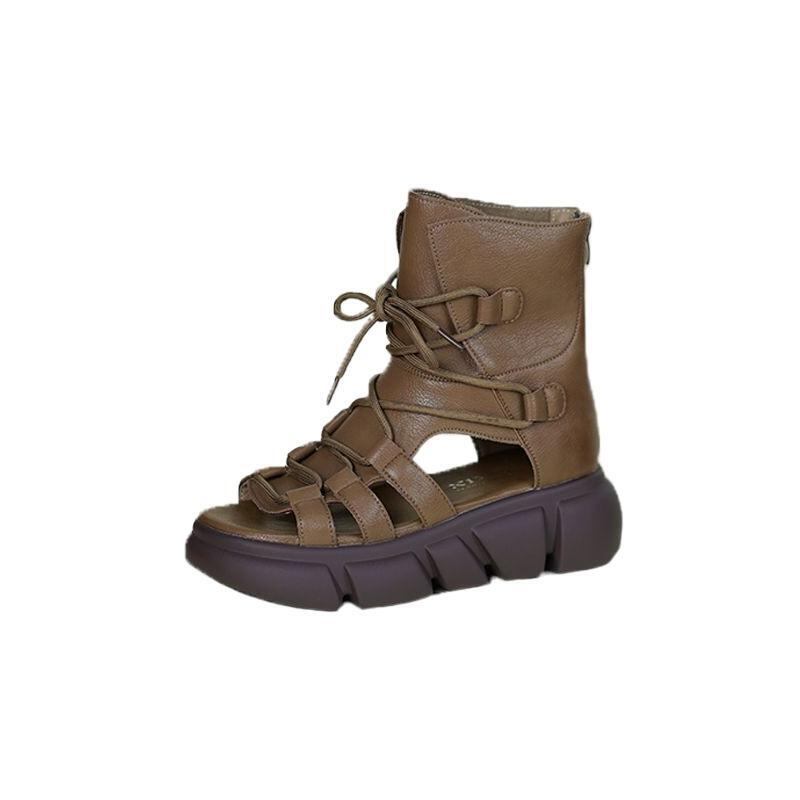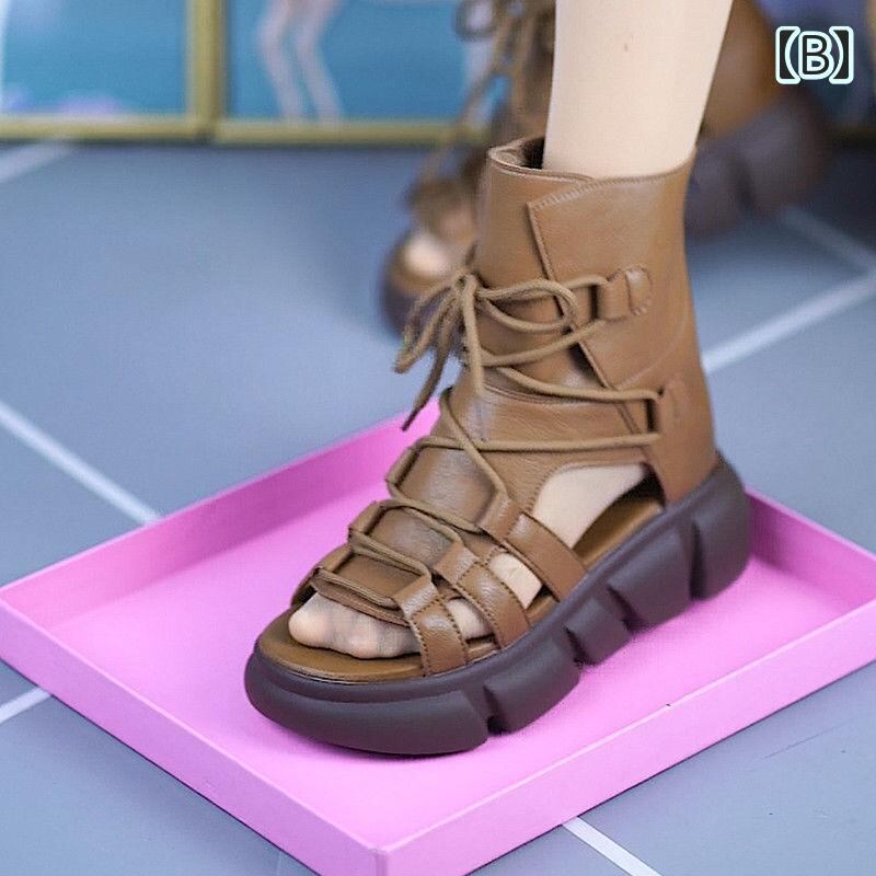 グラディエーターサンダル 厚底 カットオフ かっこいい サンダル シューズ レディース 黒 ブラック 茶色 ブラウン 編み上げ こなれ感 韓国系 PUレザー 革靴 ハイカット スニーカー風 ラフ 個性的 ユニーク 女性用 サマー オシャレ 存在感 厚底靴