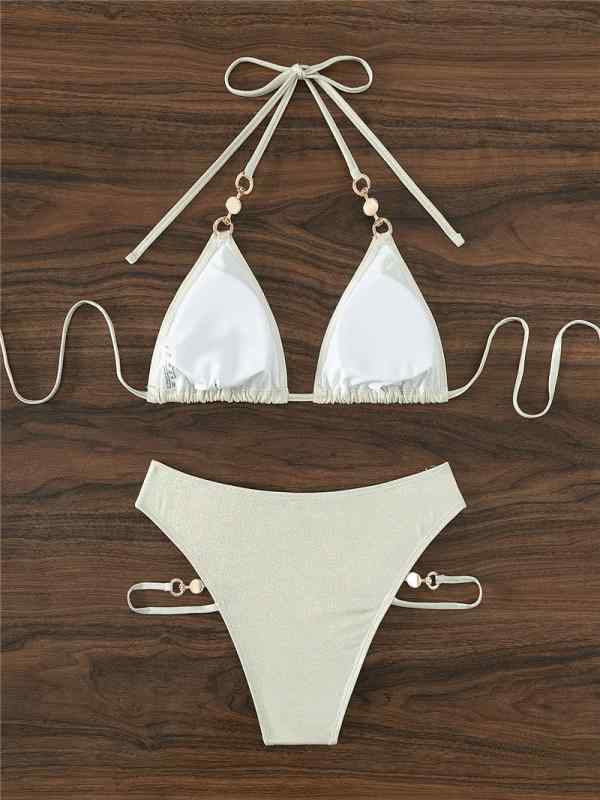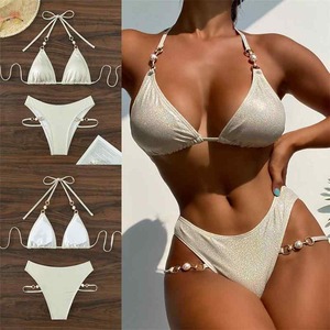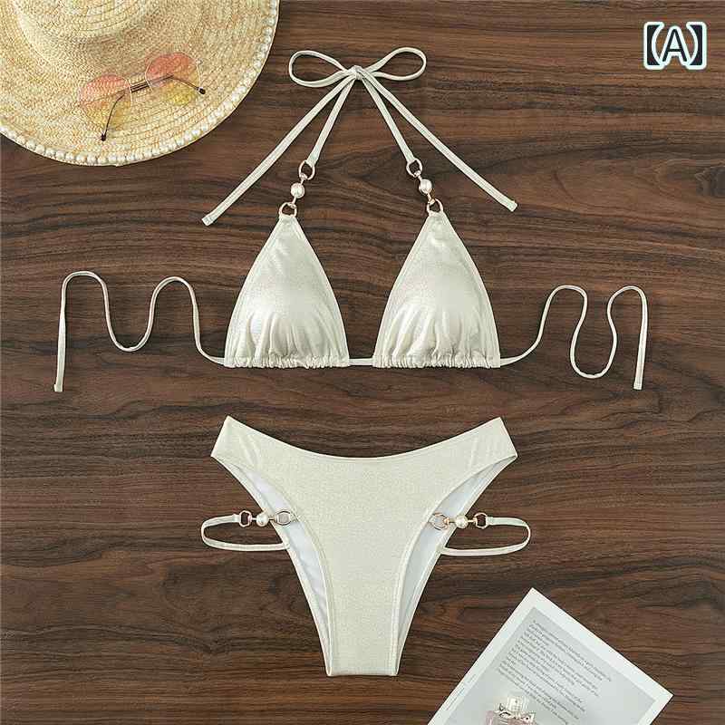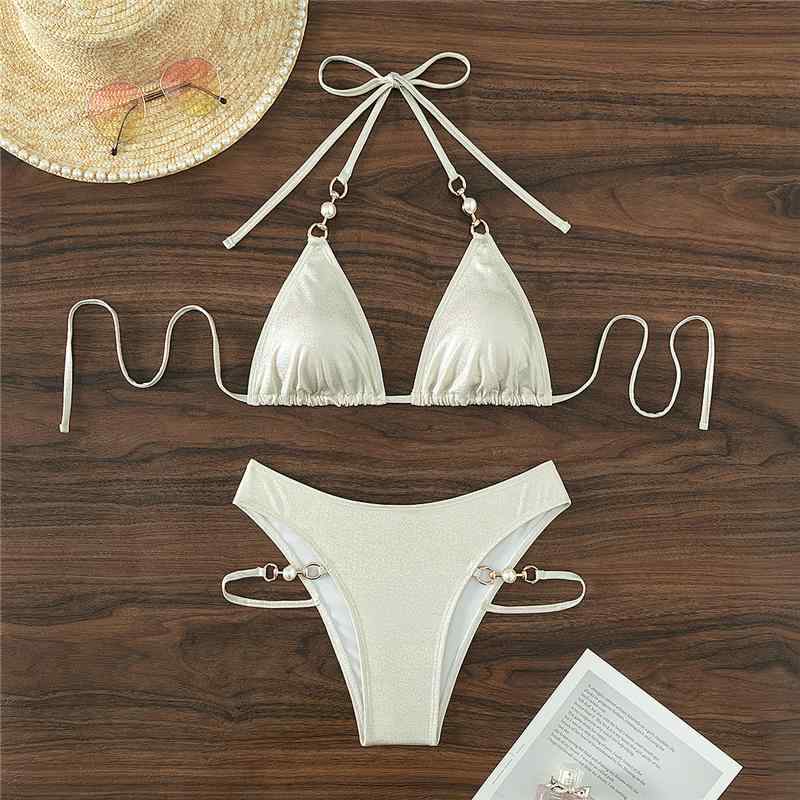 ビキニ セクシー ブラジリアン 水着 キラキラ ラメ 白 パール ビジュー 個性的 エキゾチック レディース 紐 かっこいい マイクロビキニ ホワイト 無地 ホルターネック グリッター 輝く クリスタル セパレート 海外 きれいめ エスニック アジアン