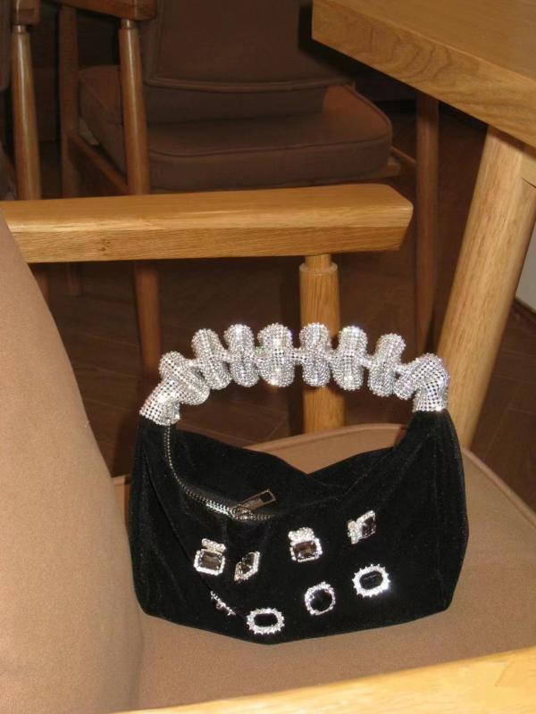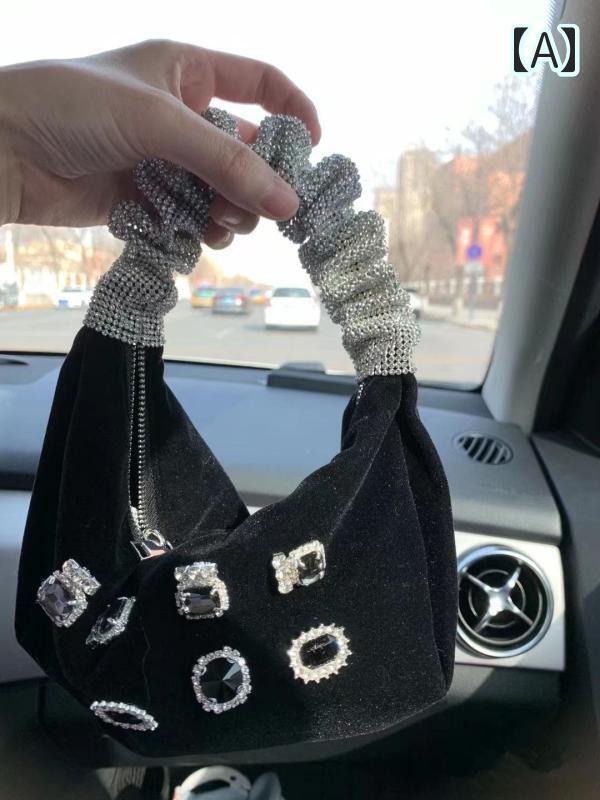 ハンドバッグ ビジュー ラインストーン キラキラ ミニバッグ パーティーバッグ 黒 ブラック 個性的 レトロ 横型 韓国系 可愛い きれいめ 宝石 クリスタル 装飾 くしゅくしゅ 手提げ 手持ち バック 鞄 PUレザー 革 こなれ感 映える オシャレ