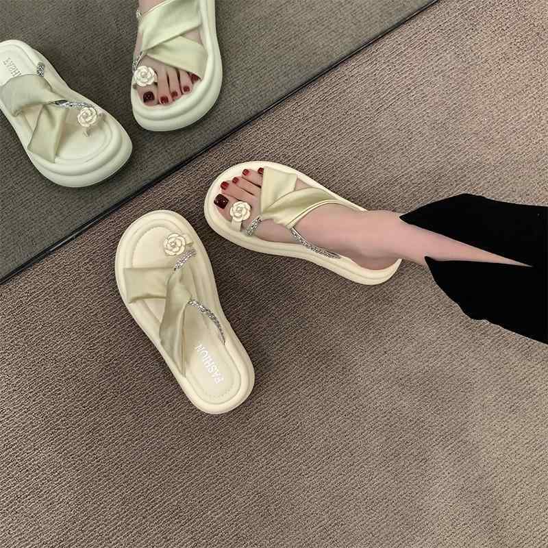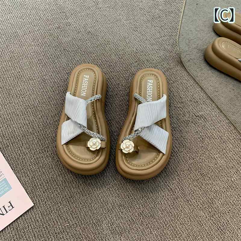 サンダル お花 フラワー キラキラ チェーン付 ビーサン トングサンダル レディース 韓国系 黒 ブラック 白 ホワイト カーキ 異素材MIX かっこいい きれいめ 厚底 スポサン ストラップ無 個性的 おしゃれ ユニーク フェミニン 親指 アクセサリー