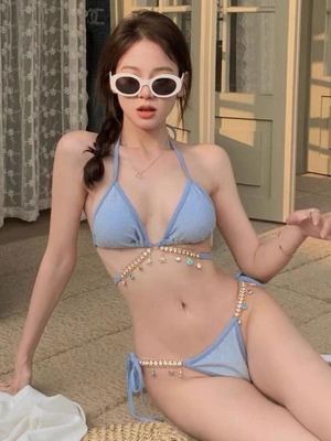 ビキニ 水着 シャツ 3点セット セクシー 可愛い キラキラ ビジュー 紐ビキニ 三角ビキニ エスニック アジアン 水色 ラメ 白シャツ セパレート 水着 上下セット 個性的 韓国系 ブラジリアン 腰紐 クリスタル ラインストーン 揺れる 女っぽ