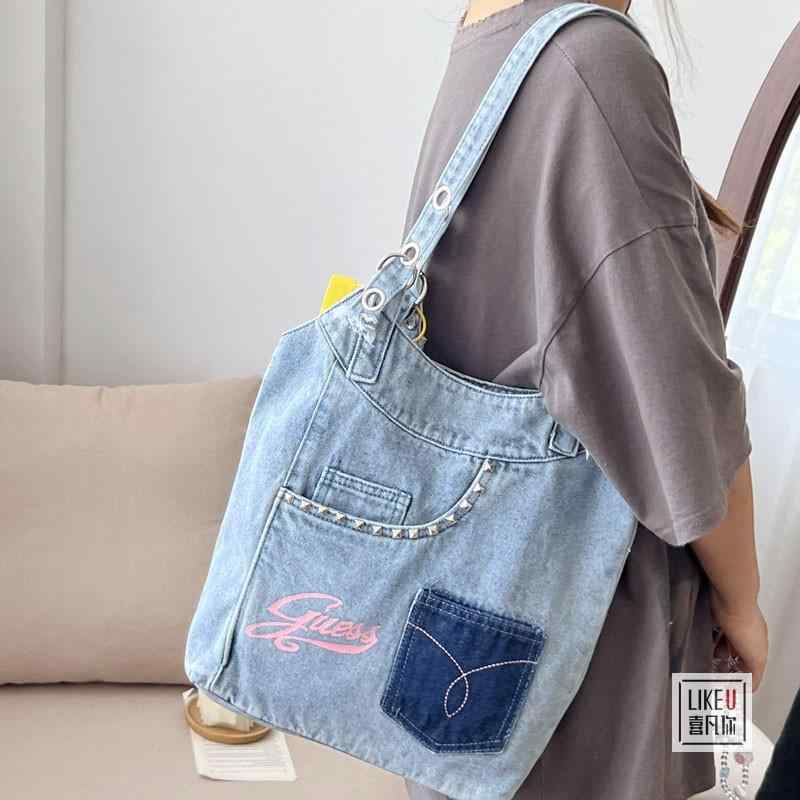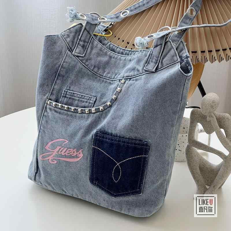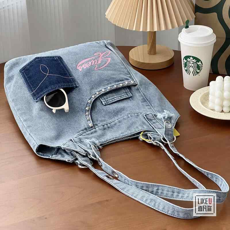 トートバッグ デニム 個性的 縦型 スタッズ かっこいい きれいめ 肩がけ バック レディース 淡色 水色 ブルーデニム バイカラー ポケット 英文字 ロゴ ジーパン風 ユニーク ヴィンテージ風 A4 大容量 インスタ 映える 他にない 学生 通学 ラフ