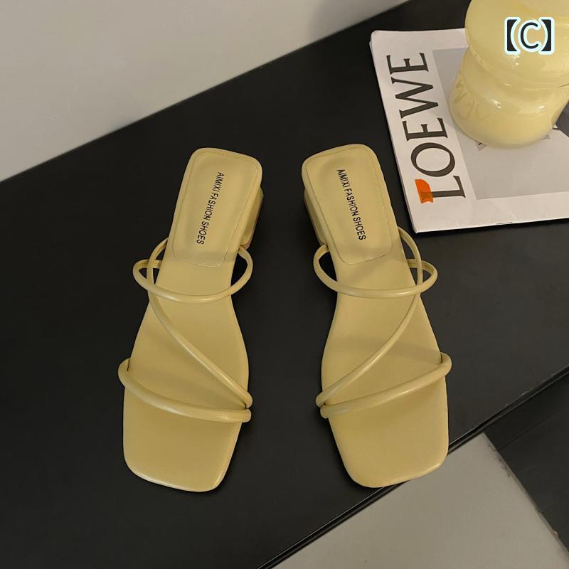 サンダル きれいめ かっこいい 紐 スクエアトゥ 黒 白 黄色 無地 大人可愛い ミュール ビーサン 韓国系 シンプル ベーシック 通勤 通学 涼しげ 春夏 シューズ レディース ブラック ホワイト イエロー ローヒール 太ヒール ヌーディー ラフ