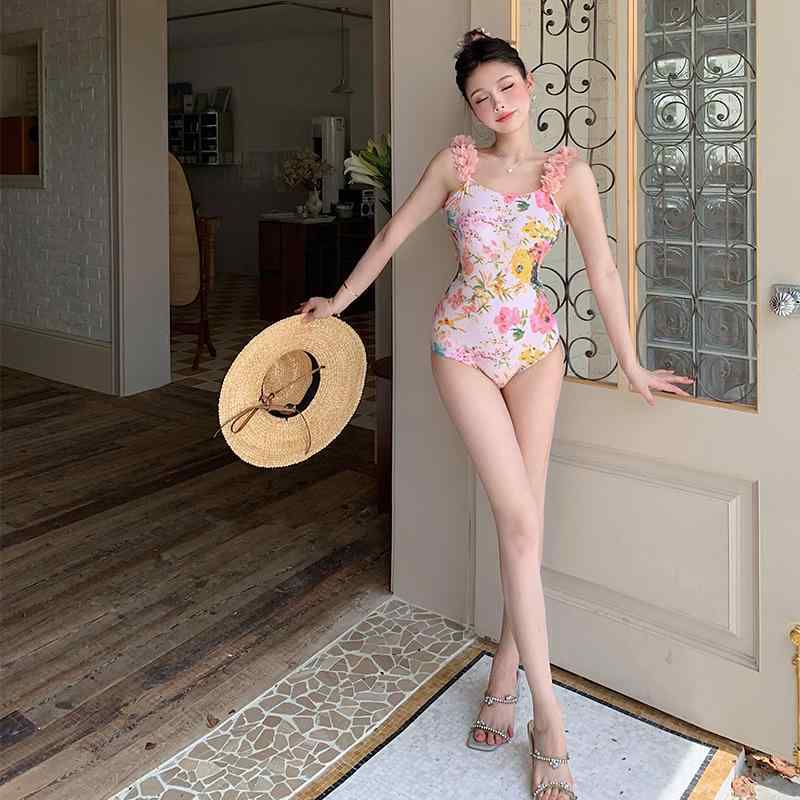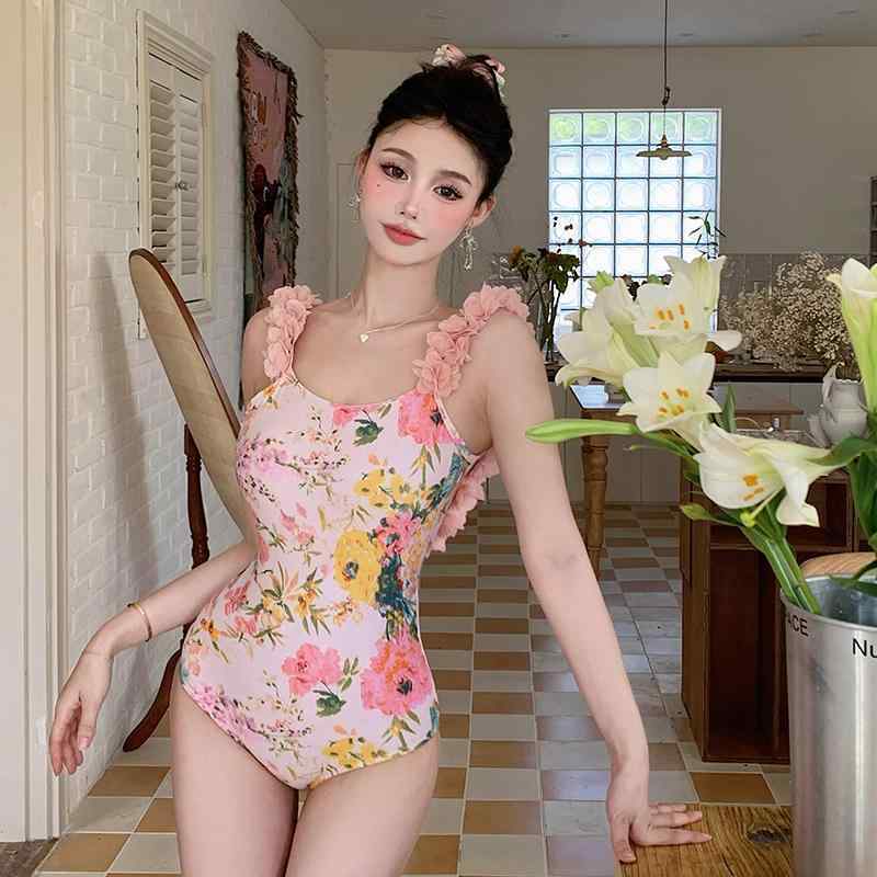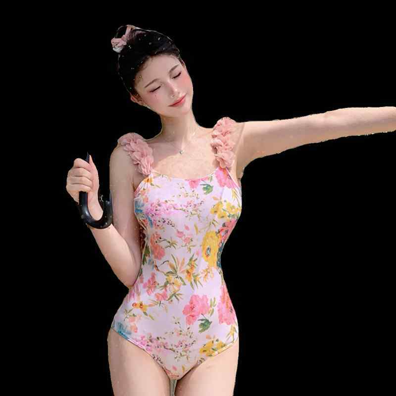 ワンピース 水着 花柄 フリル 可愛い 個性的 フラワー ボタニカル ピンク バックシャン 背中見せ 韓国系 水着 ワンピ レトロ きれいめ 体型カバー オープンバック フリフリ オールインワン 水着 つなぎ 目立つ 海外 モデル 撮影 衣装 存在感