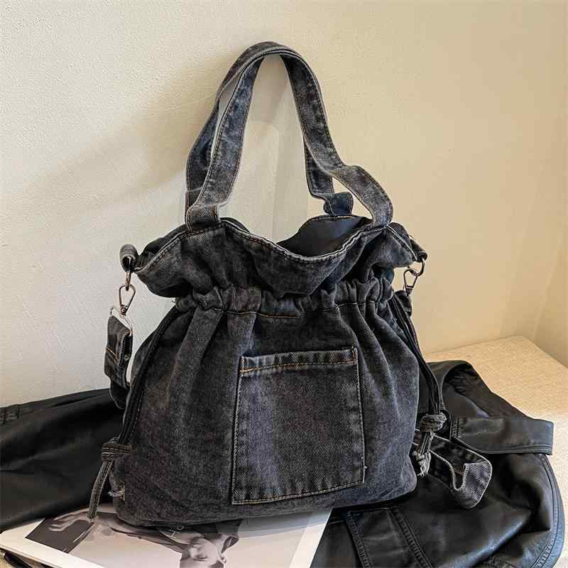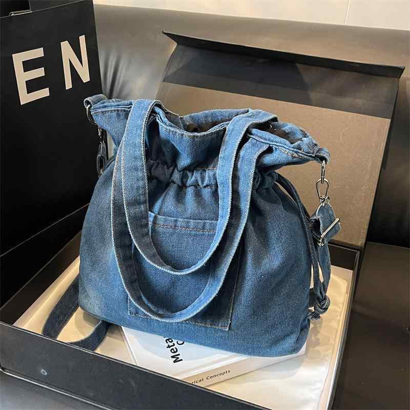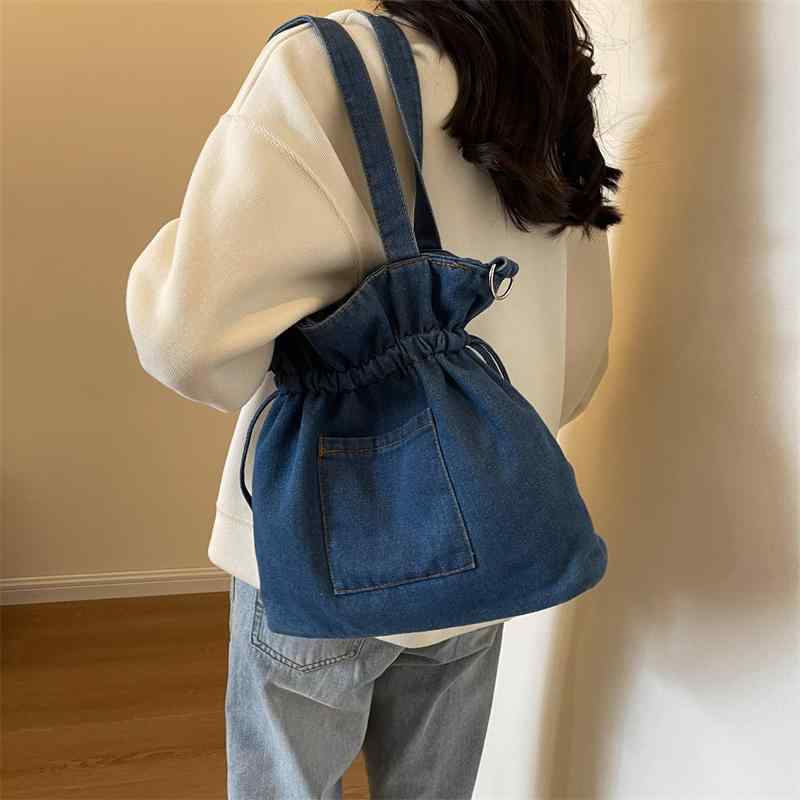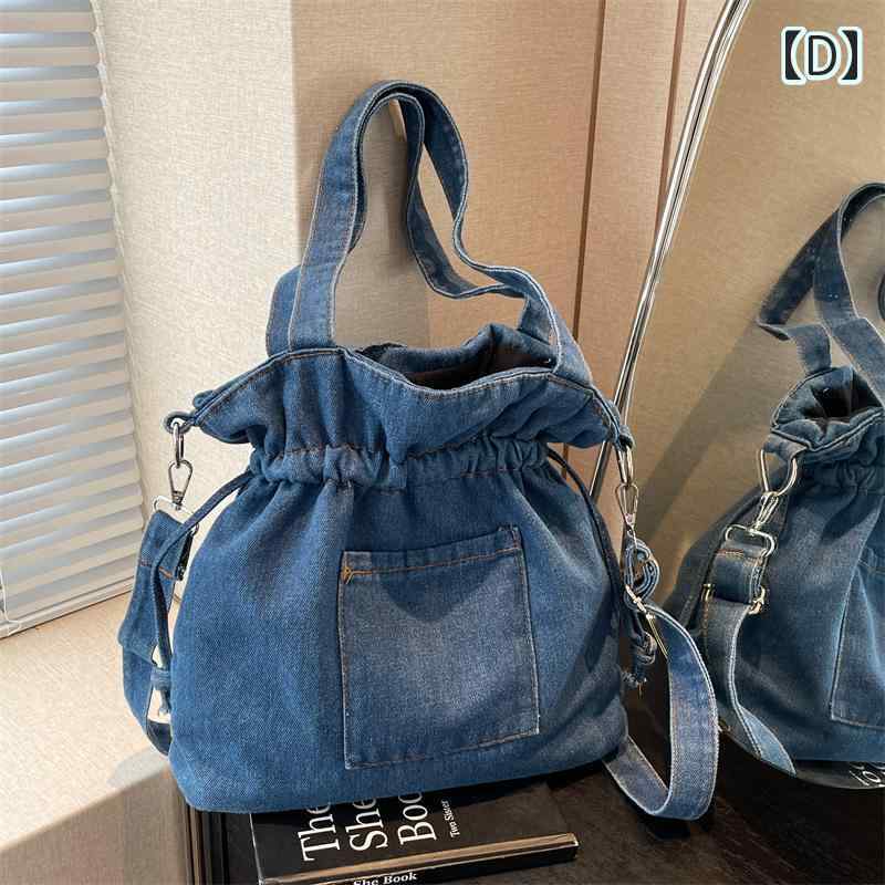 ショルダーバッグ デニム 巾着型 トートバッグ 個性的 レトロ 可愛い レディース オシャレ ブルーデニム 青 大容量 A4 斜め掛け 肩掛け 手提げ バック オシャレ ユニーク コロン 台形 ポケット ジーンズ デニム生地 きれいめ 通勤 学校 通学