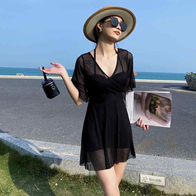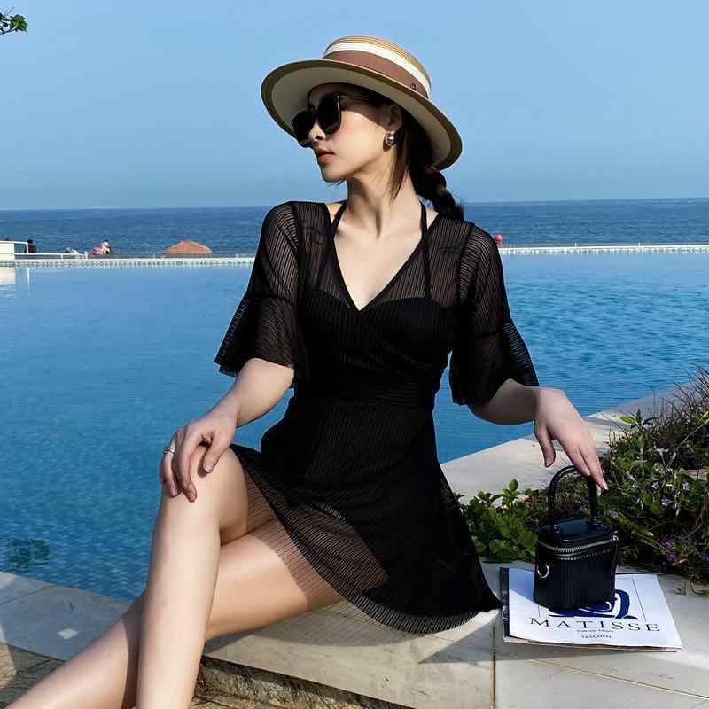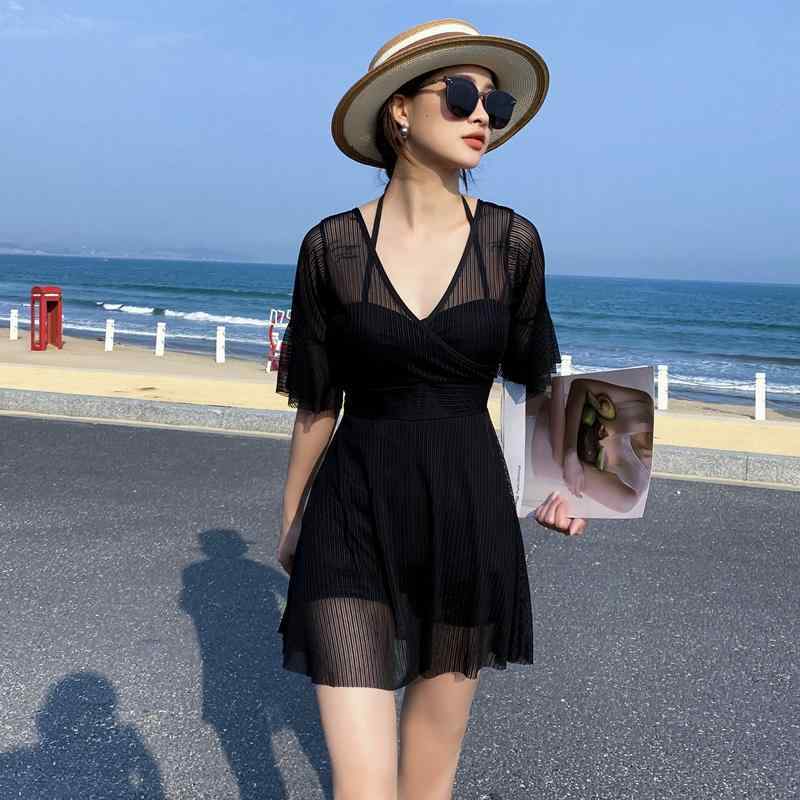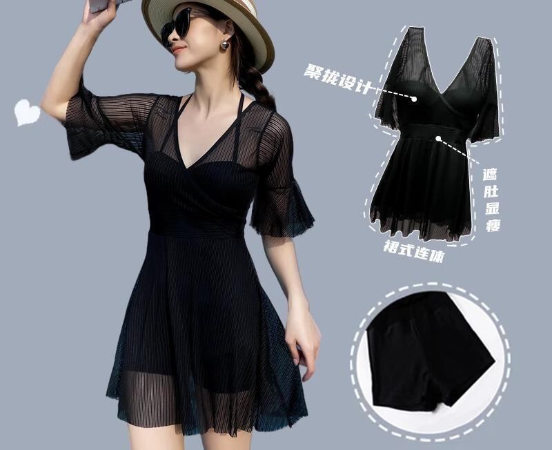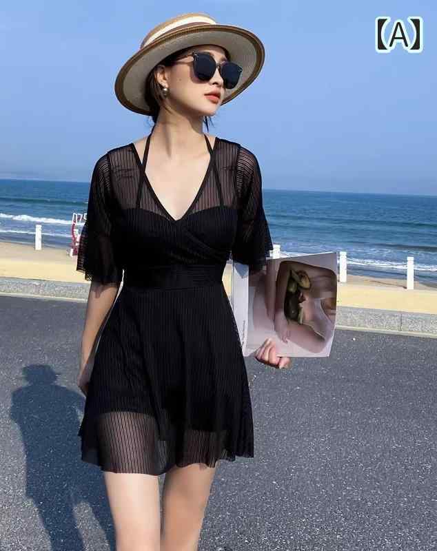 ワンピース 水着 スカート 黒 レディース 袖あり 体型カバー 透け感 シアー 韓国系 きれいめ ドッキング ワンピ 水着 半袖 ショートパンツ ハイウエスト 二の腕 腹 尻 脚 カバー 個性的 日焼け防止 ブラック 無地 大きいサイズ 2XL ママ