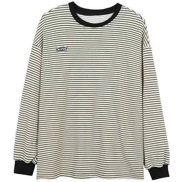 トレーナー ストライプ 大人可愛い プルオーバー 韓国系 トップス 長袖 ドロップショルダー 黒 ブラック ベージュ ボーダー スウェット ラウンドネック 可愛い カジュアル トップス 大きめ ダボっと ゆるっと カジュアル スポーティー ルーズ ラフ