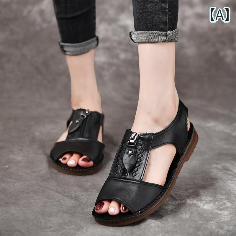 サンダル ぺたんこ グラディエーター シューズ レトロ きれいめ 黒 ブラック 白 ホワイト 赤 レッド 茶色 ブラウン 無地 PUレザー 革靴 個性的 メンスライク フラットシューズ ストラップ付 こなれ感 ラフ ファスナー ペタンコ アンニュイ