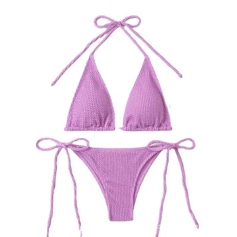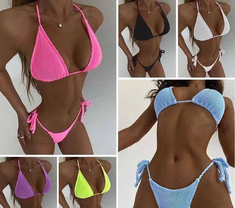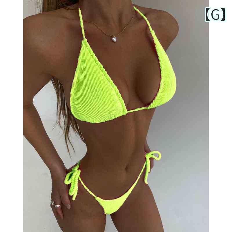 ビキニ セクシー ブラジリアン レディース ニット クロシェ 三角ビキニ 紐 かっこいい マイクロビキニ 蛍光 ピンク 緑 黄色 紫 黒 白 赤 水色 無地 ホルターネック セパレート 水着 女性用 海外 モデル かっこいい パッド入り リボン