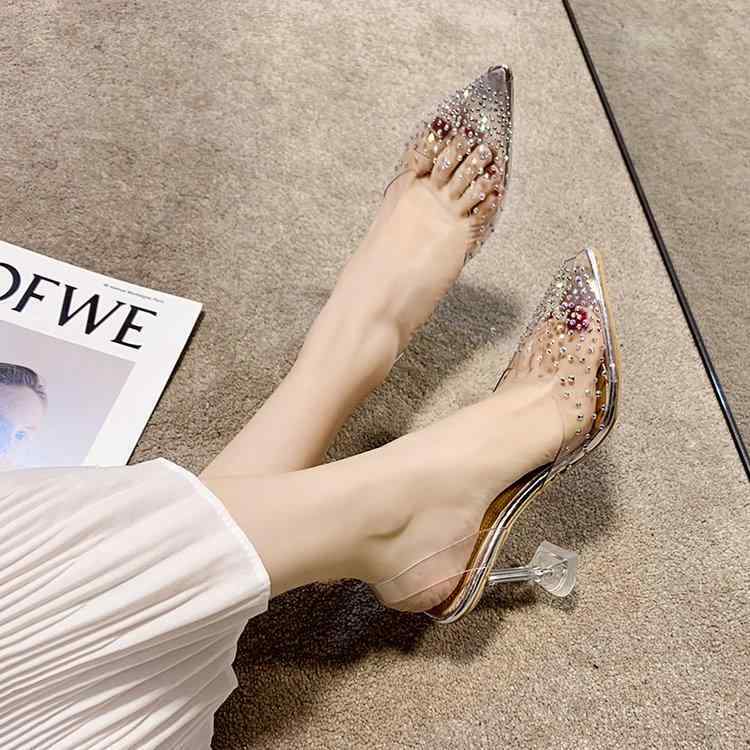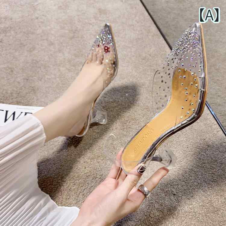 ミュール パンプス キラキラ ビジュー 透明 クリア 可愛い 個性的 スリッポン 春夏 シューズ レディース 透け感 クリスタル ラインストーン きれいめ ポインテッドトゥ ピンヒール ヌーディー ストラップ付 オーロラ アンニュイ パーティー 華やか
