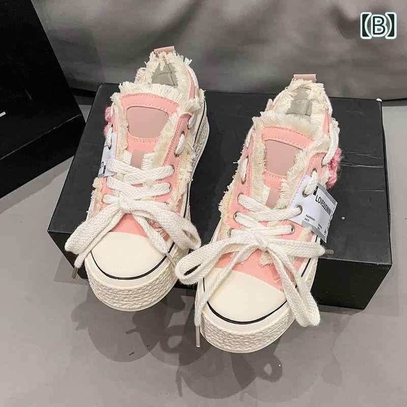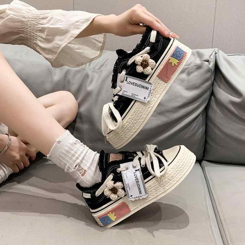 スニーカー 厚底 キャンバス 帆布 お花 フラワー 毛糸 フリンジ 可愛い 個性的 シューズ 韓国系 白 黒 ピンク バイカラー ユニーク 目立つ 花 装飾 立体的 切りっぱなし加工 ホワイト ブラック 学生 通学 運動靴 厚底靴 コスプレ アイテム