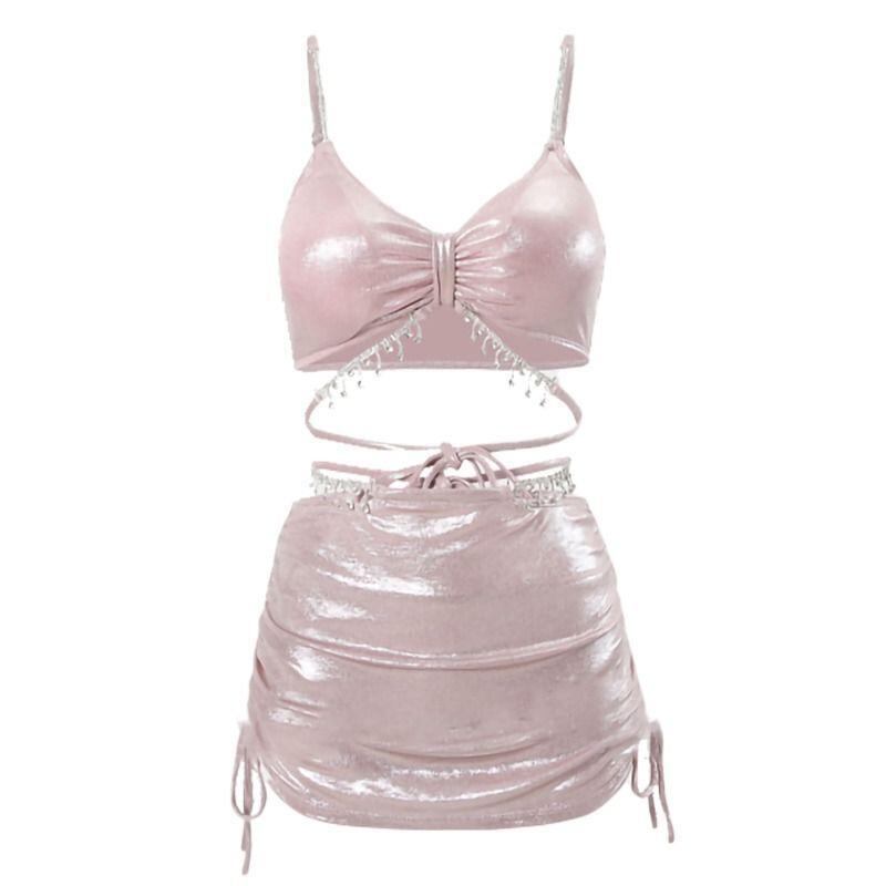 ビキニ 水着 スカート レディース セクシー 黒 ピンク キラキラ ビジュー セパレート 水着 上下セット 個性的 韓国系 サイドリボン 腰紐 クリスタル ラインストーン ブラ ブラック 光沢 シャーリング 体型カバー 尻 太もも カバー