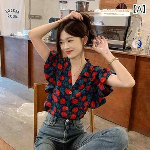 シャツ バラ柄 花柄 ブラウス 襟付き フレンチスリーブ 可愛い 個性的 韓国系 トップス 春夏 レディース 赤い 薔薇 フラワー 模様 ダークカラー バイカラー 前開き ボタン vネック フリル キュート キレイ レトロ こなれ感 クール オルチャン