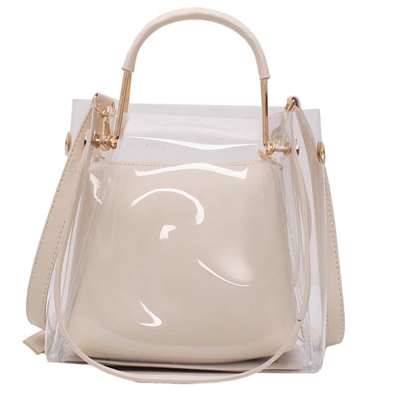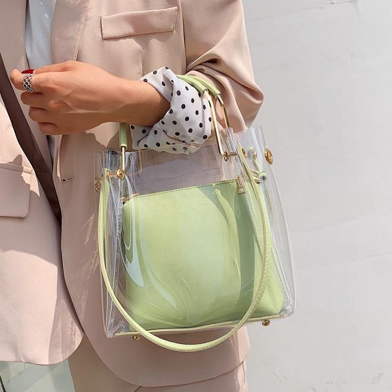 ビニールバッグ ショルダーバッグ 可愛い きれいめ スクエア型 透明 バックインバック付 レディース 春夏 PVC ハンドバッグ 2way こなれ感 台形 黒 白 緑 黄色 バイカラー グリーン イエロー 斜め掛け 肩がけ 手提げ バック 鞄 撥水