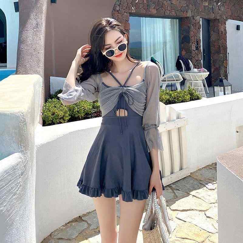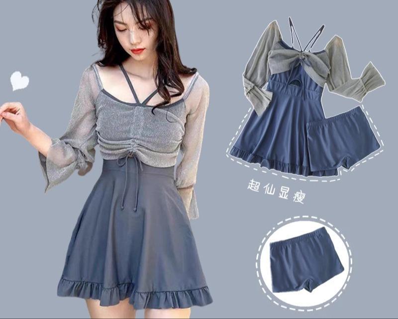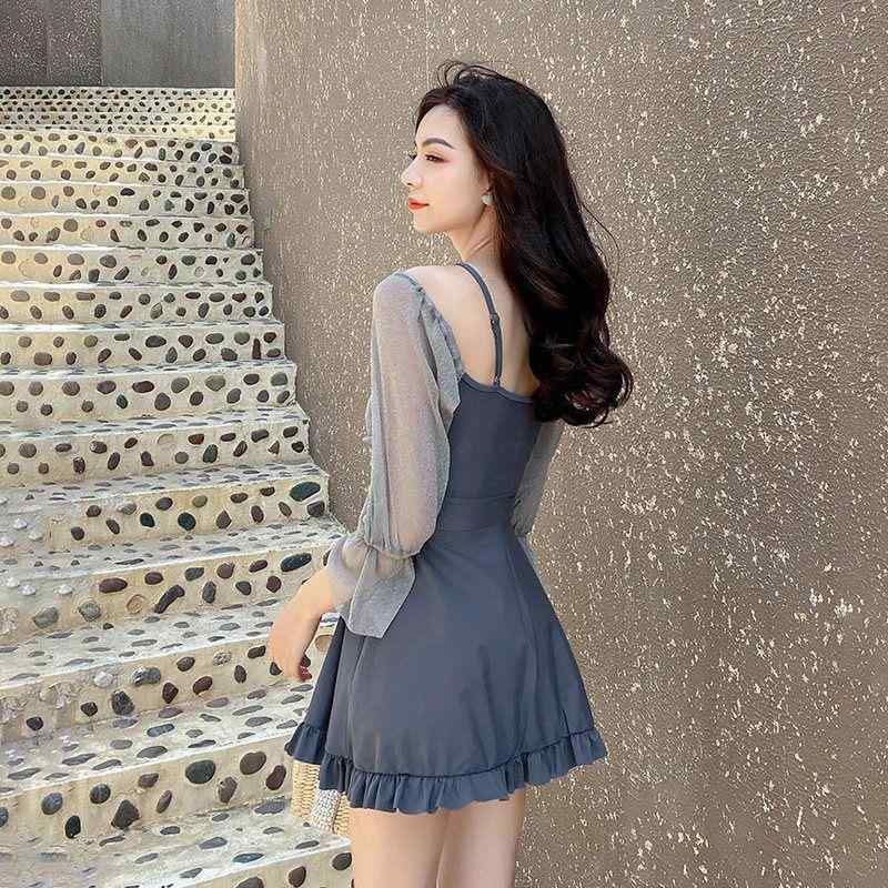 ワンピース 水着 スカート レディース 袖あり 体型カバー 水着 韓国系 大人可愛い きれいめ ドッキング ワンピ 水着 長袖 透け感 バイカラー 青 フリル シャーリング 女の子 オールインワン ショートパンツ 大きいサイズ XL 2XL 脚カバー